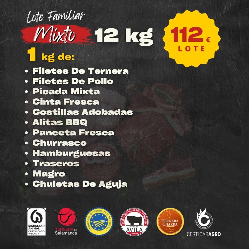 El Lote Familiar Mixto de 12 kg ofrece una variedad de cortes de carne de alta calidad, incluyendo filetes de ternera, pollo, picada mixta, costillas adobadas, alitas BBQ, churrasco, panceta fresca, hamburguesas, traseros, magro y chuletas de aguja. Ideal para cenas familiares, barbacoas y comidas variadas, brindando una opción deliciosa y económica para disfrutar de diferentes sabores.